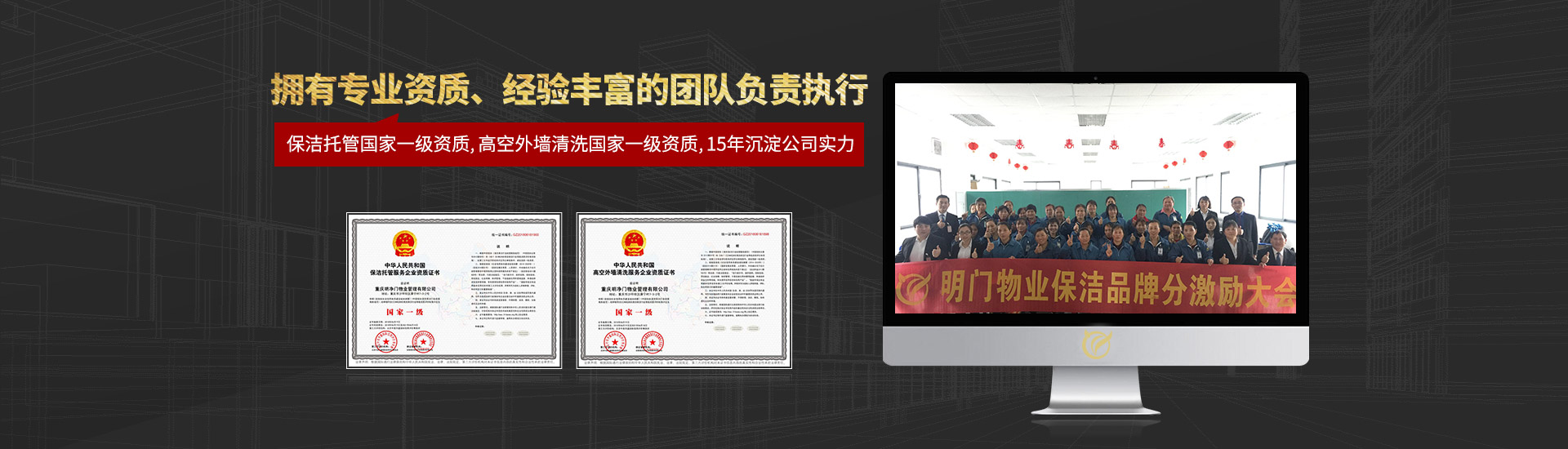 現(xiàn)有員工800多名,100%持證上崗,更有外墻清洗、開荒清潔等專業(yè)服務(wù)人員200余名